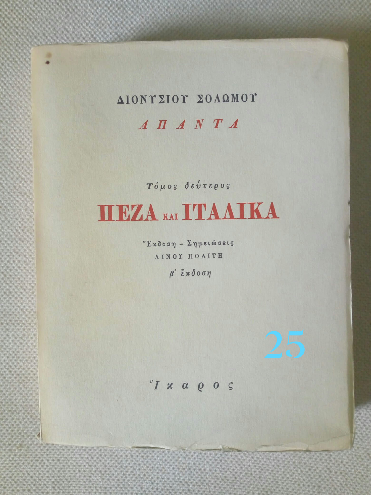 Άπαντα Πεζά και Ιταλικά Διονύσιος Σολωμός Ίκαρος 1968 β΄έκδοση