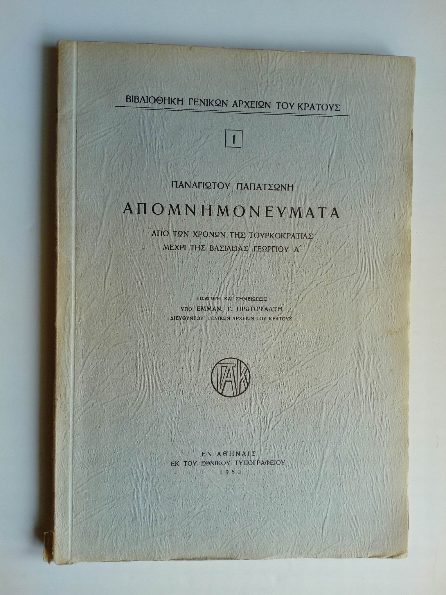 Απομνημονεύματα Παναγιώτου Παπατσώνη Εν Αθήναις Εκ του Εθνικού Τυπογραφείου 1960