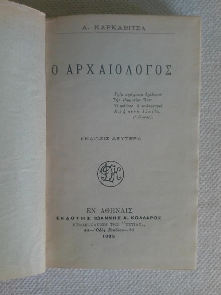 Ο αρχαιολόγος Α.Καρκαβίτσας Εκδότης Ιωάννης Δ. Κολλάρος δευτέρα έκδοσις Αθήναι 1925