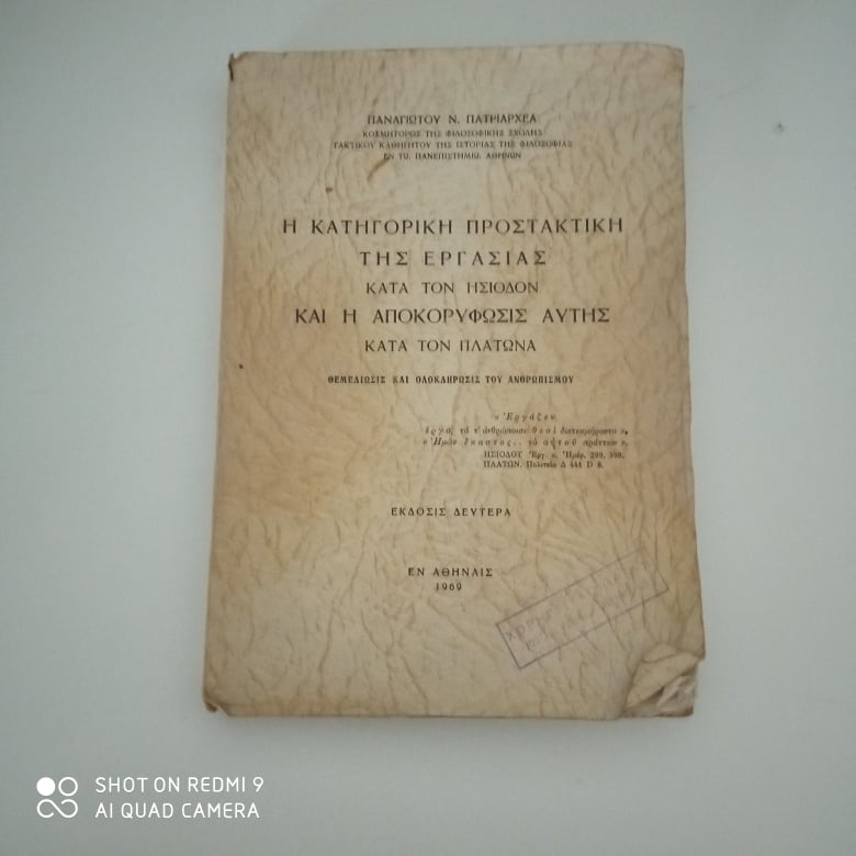 Η κατηγορική προστακτική της εργασίας κατά τον Ησίοδον και η αποκορύφωσις αυτής κατά τον Πλάτωνα Παναγιώτης Ν. Πατριαρχέας Αθήναι 1969