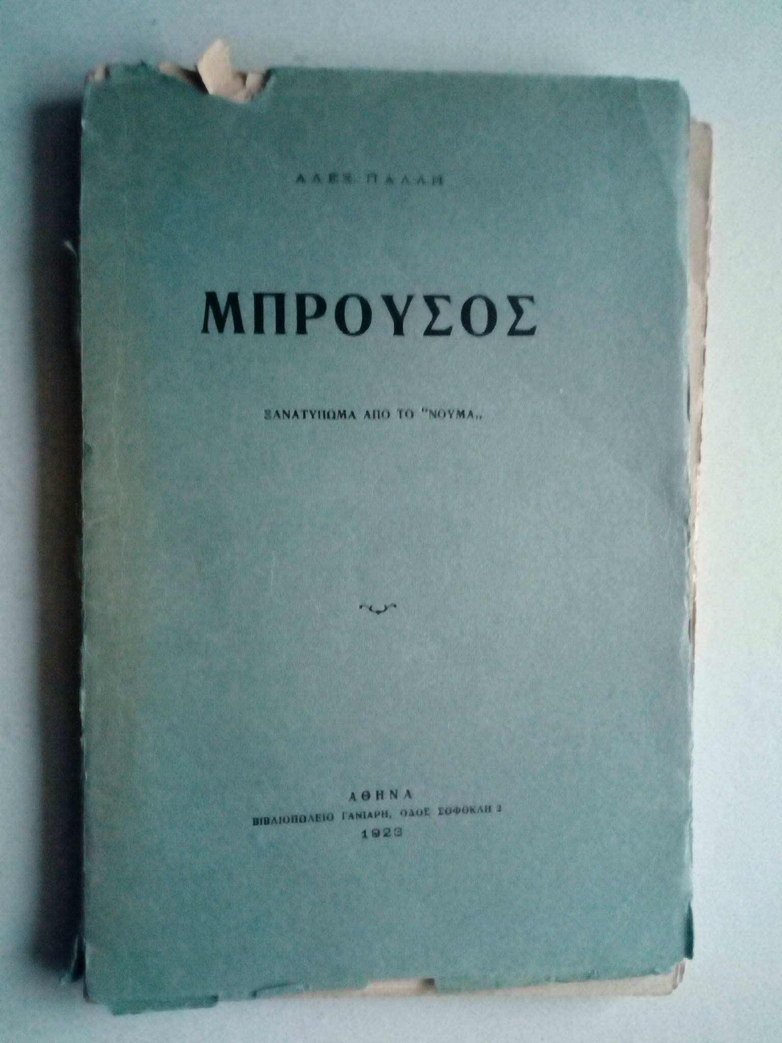 Μπρουσός Αλεξ. Πάλλης Αθήνα, βιβλιοπωλείο Γανιάρη, 1923 Ξανατύπωμα από το «Νουμά».