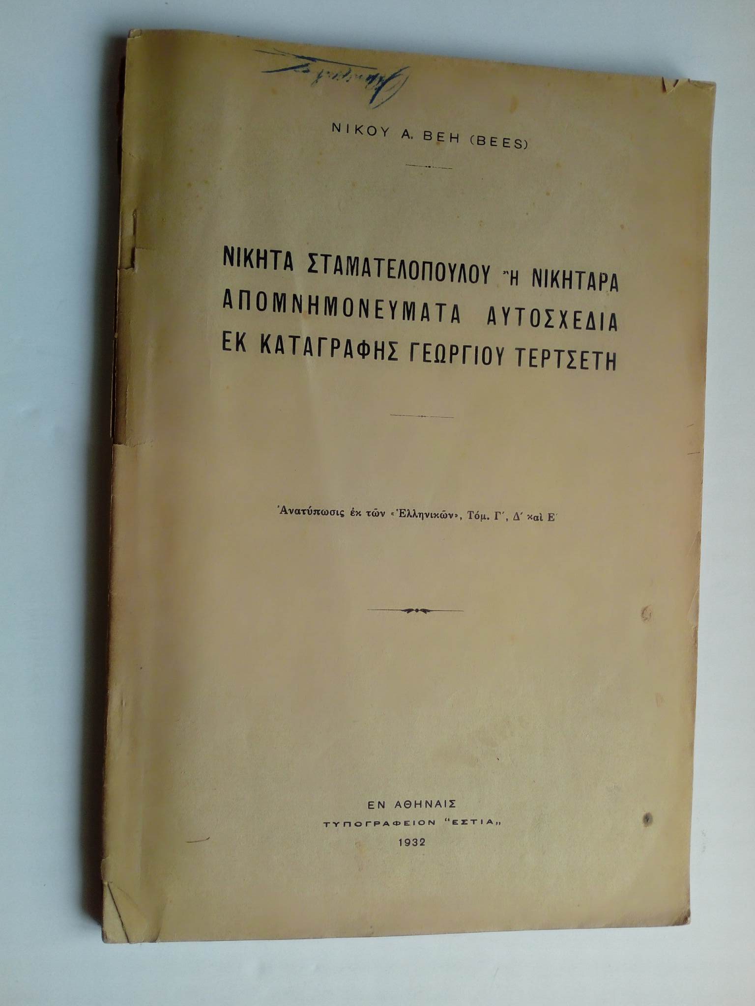 Νικήτα Σταματελόπουλου ή Νικηταρά Απομνημονεύματα αυτοσχέδια εκ καταγραφής Γεωργίου Τερτσέτη Εν Αθήναις Τυπογραφείον «Εστία» 1932 Νίκος Α. Βέης